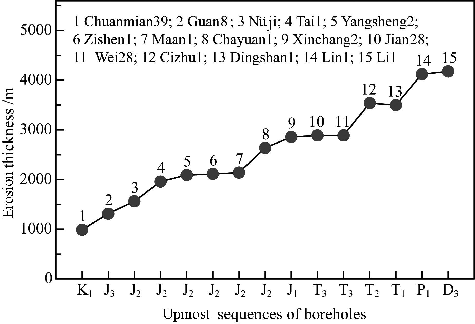 (2)There exists a clear correlation between the erosion thickness and the upmost sequence of the well: the greater age of the upmost sequence, the greater erosion thickness at the location of the wells, and vice versa.
