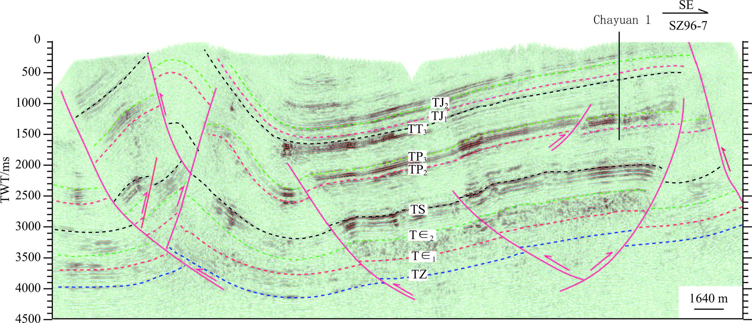Fig.6 Seismic interpretation profile across Chayuan1 well in the Western Hubei Eastern Chongqing area |