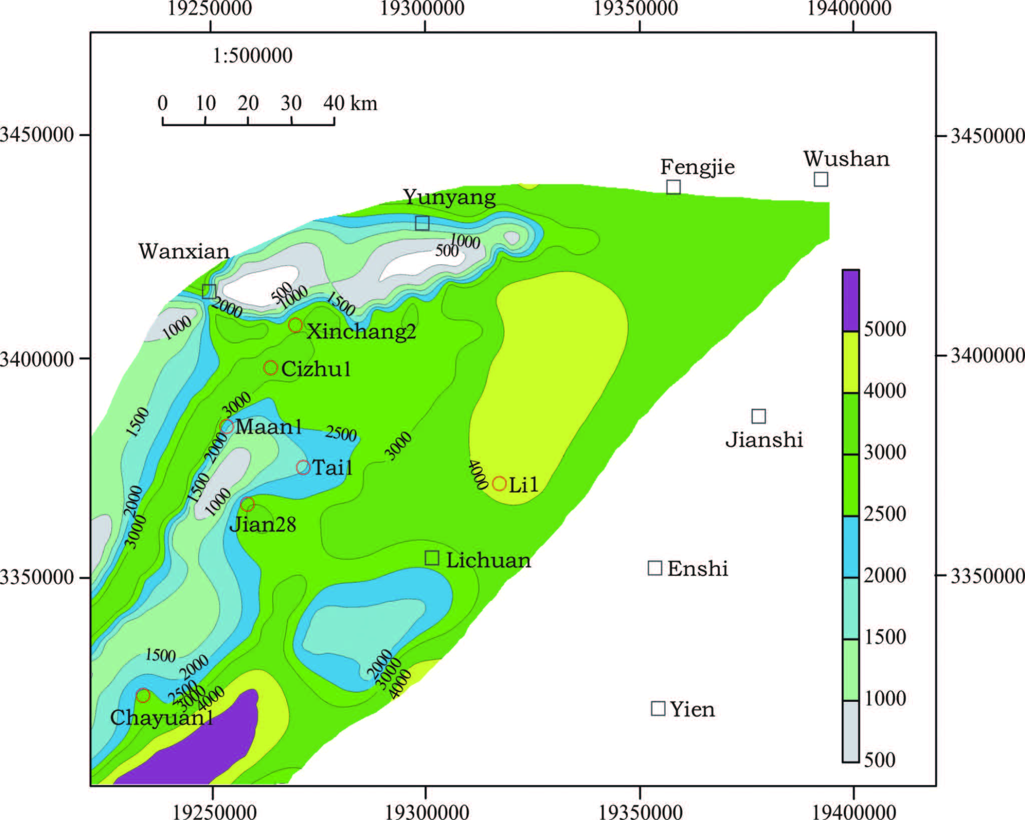 Fig.4 Erosion thickness of boreholes in the Western Hubei Eastern Chongqing area |