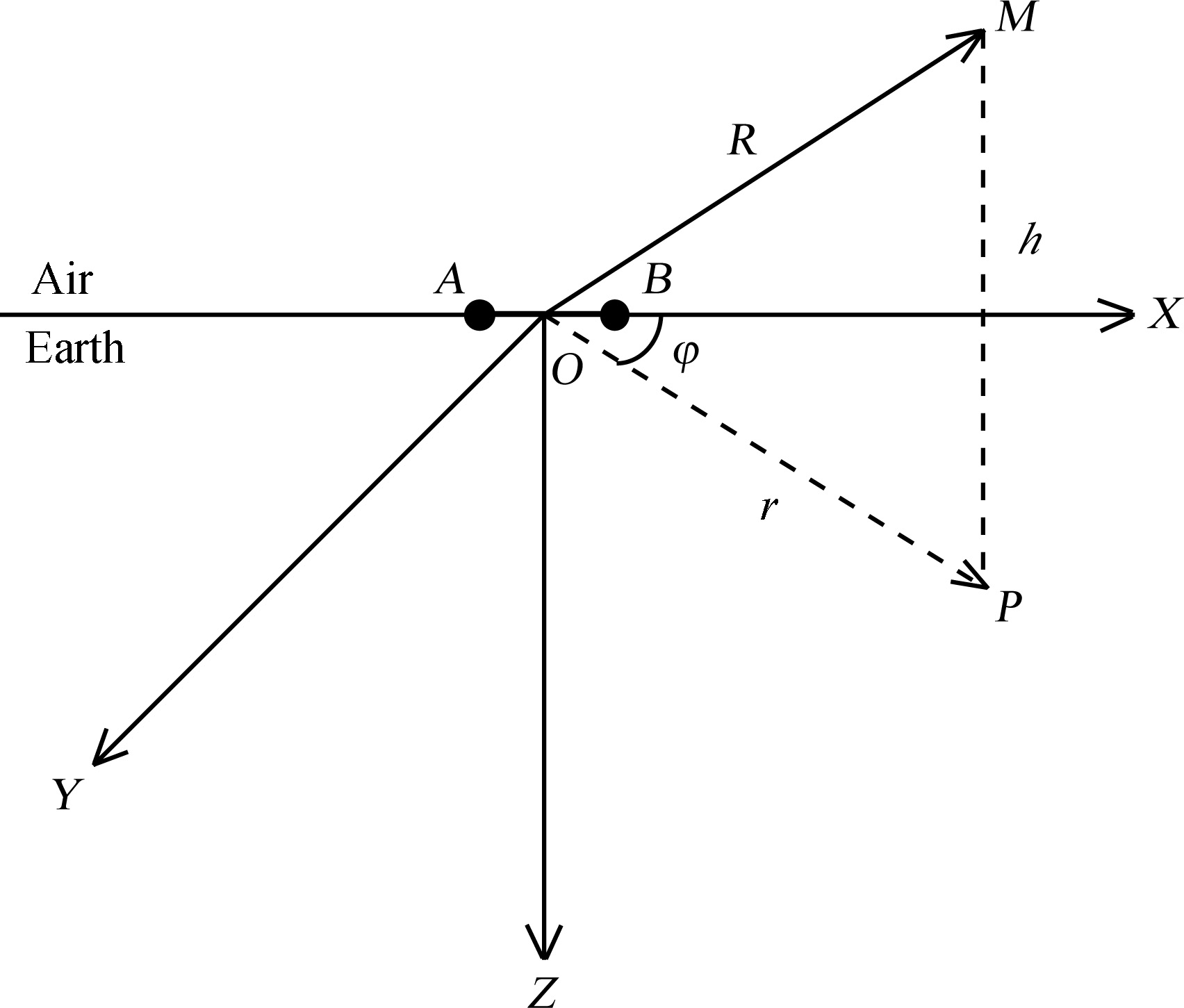 As shown in Fig. 1, source AB is a horizontal electric dipole placed on the surface of the homogeneous earth in X direction, with a length of ds and current I = I0e-iωt. The origin of coordinates O is the central point of AB. The Z axis points downwards. The projection on the surface of any point M in the air is P. The distance from O to P is r, and the angle between r and X direction is φ.