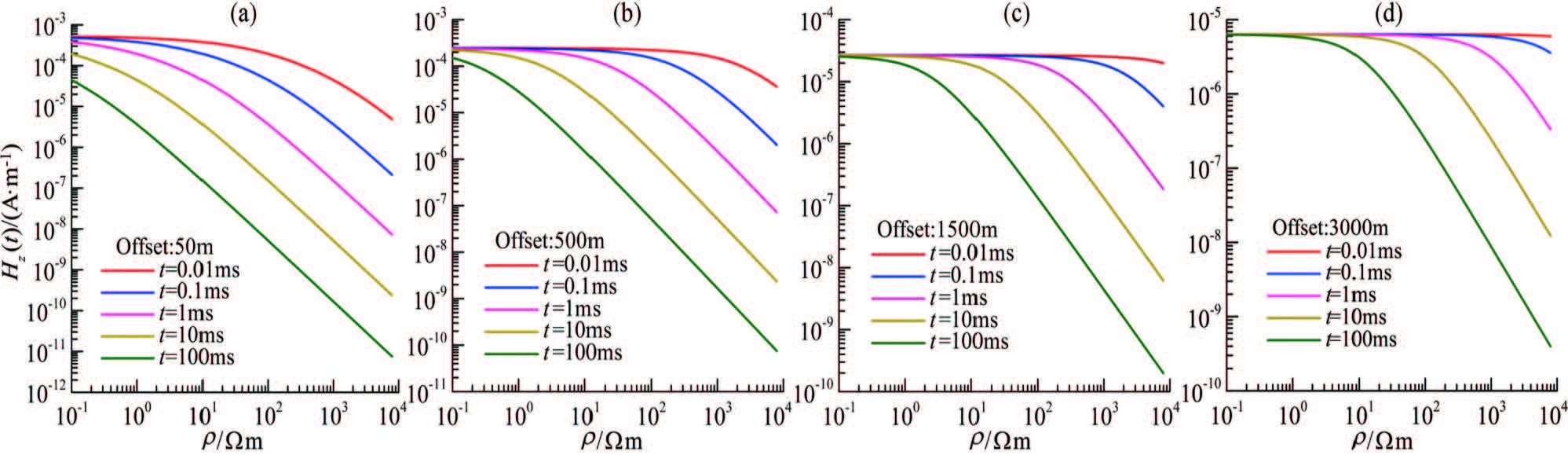 Vertical component of the magnetic field at different times with different offsets in homogeneous half-space (a)Offset 50 m;(b)Offset 500 m;(c)Offset 1500 m;(d)Offset 3000 m. |