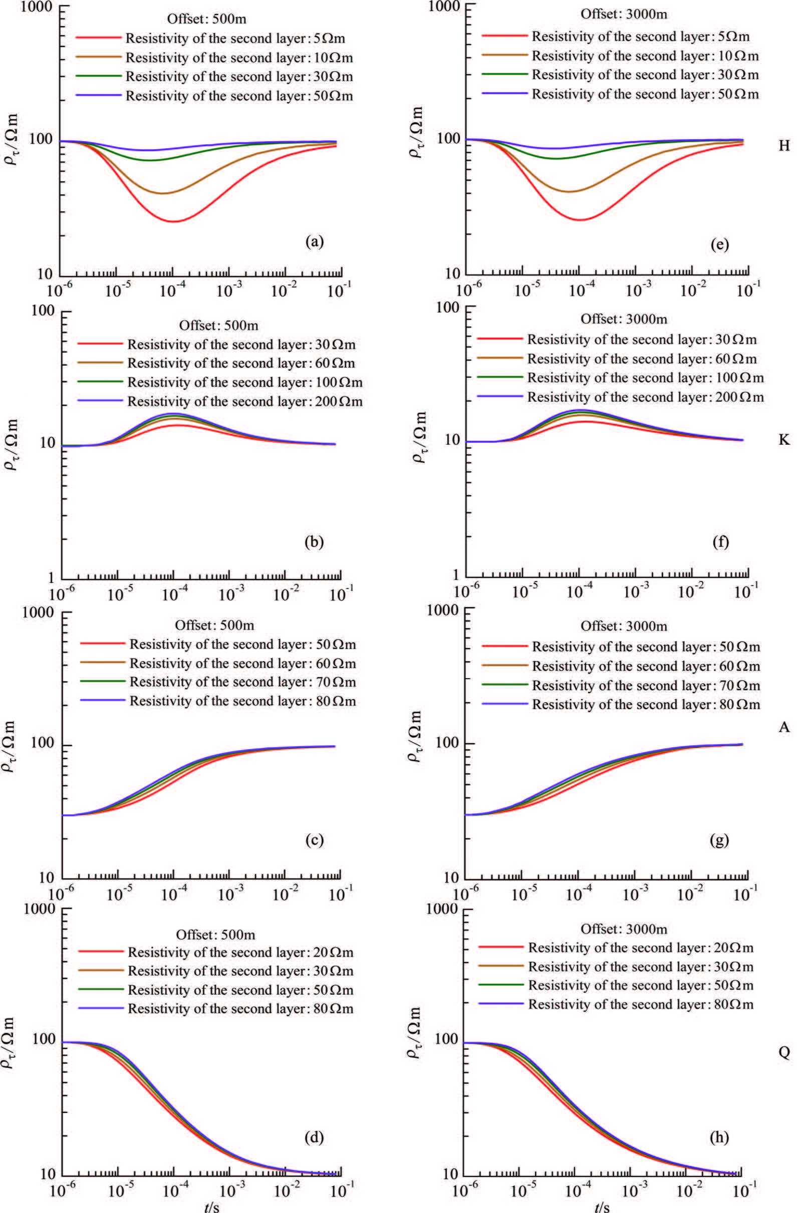 Full field apparent resistivity of three-layered models with different resistivities of the second layer at two typical offsets (a)H model, offset 500 m;(b)K model, offset 500 m;(c)A model, offset 500 m;(d)Q model, offset 500 m;(e)H model, offset 3000 m;(f)K model, offset 3000 m;(g)A model, offset 3000 m;(h)Q model, offset 3000 m. |