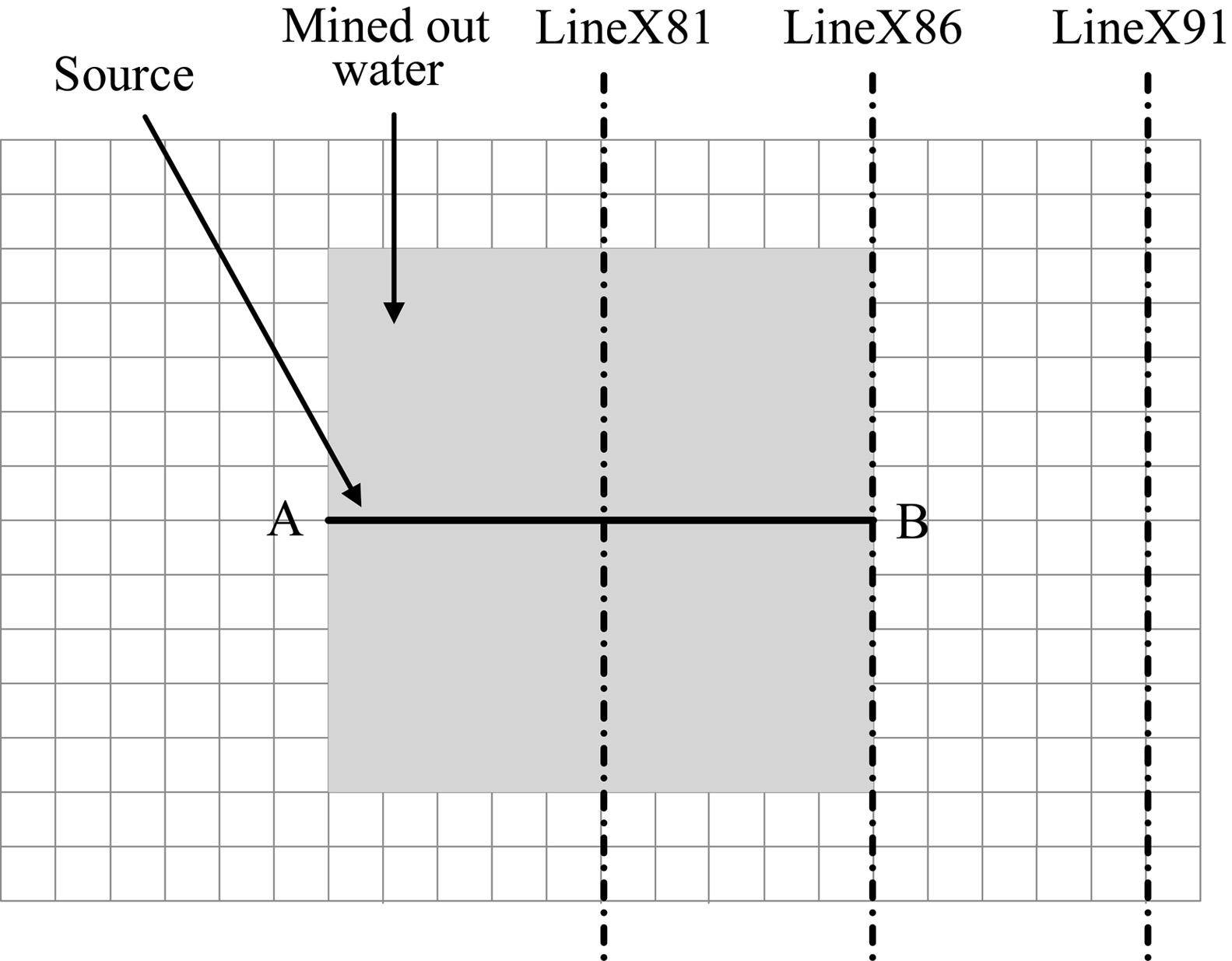 Fig.6 Diagram of a complex model with one mined out water body |