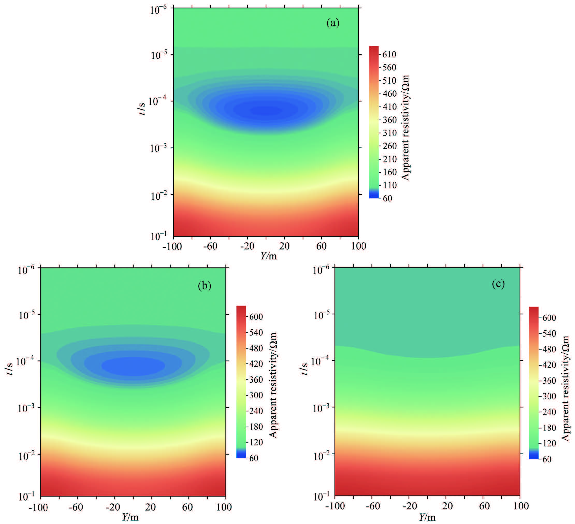 Apparent resistivity contours of the selected lines (a)Apparent resistivity contour of LineX81;(b)Apparent resistivtiy contour of LineX86;(c)Apparent resistivity contour of LineX91. |