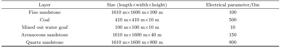 A model with a mined out water goaf is designed to test the efficiency of our method. As shown in Fig. 6, the goaf is placed within a coal bed. The upper and middle layers of the coal bed are fine s and stone and arenaceous s and stone, respectively. The lower layer of the model is quartz s and stone. Parameters of the model are listed in Table 1.