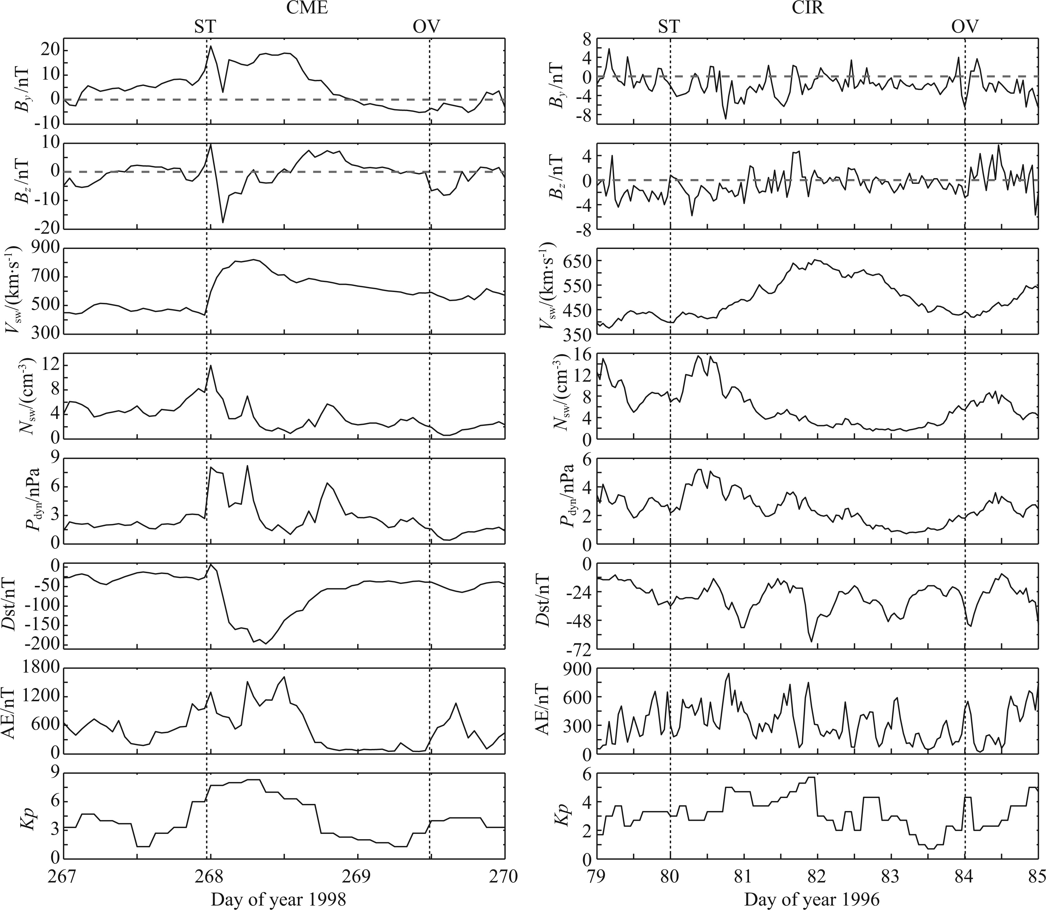 Right panels of Fig. 1 is a CIR event and its driven storm. As shown by the two vertical dashed lines, the start time was at 00:00UT on DOY 80(Mar. 20), 1996 and the end time was at 00:00UT on doy 84(Mar. 24), 1996. The duration was about 4 days. During the considered time period, solar wind parameters and geomagnetic indices varied as follows:(1)The southward IMF Bz is as small as -5.8 nT at 07:00UT on DOY 80, but the y and z components of IMF oscillated more frequently. The solar wind speed increased from 397 km·s-1 to 653 km·s-1, reaching its maximum at 23:00 UT on DOY 81 and then decreasing slowly. The solar wind proton density and dynamic pressure also decreased slowly. The peak value of the proton density was 15.5 cm-3 and the solar wind dynamic pressure was below 6 nPa.(2)The minimum Dst was -66 nT at 22:00UT on DOY 81, indicative of a moderate geomagnetic storm. No SSC occurred. The maximal AE index was 844 nT at 19:00UT on DOY 80. AE oscillated obviously, indicating the occurrence of substorms. The maximum Kp was 5.7. The Kp value of ~3 lasted a long time, corresponding to a recovery phase over one day. Relatively weak storms and long recovery phase of Kp are representative characteristics of CIR-driven storms(Borovsky and Denton, 2006; Chen et al., 2012).