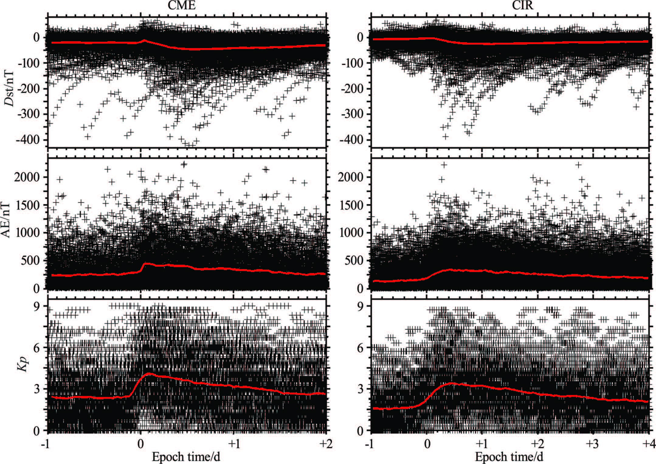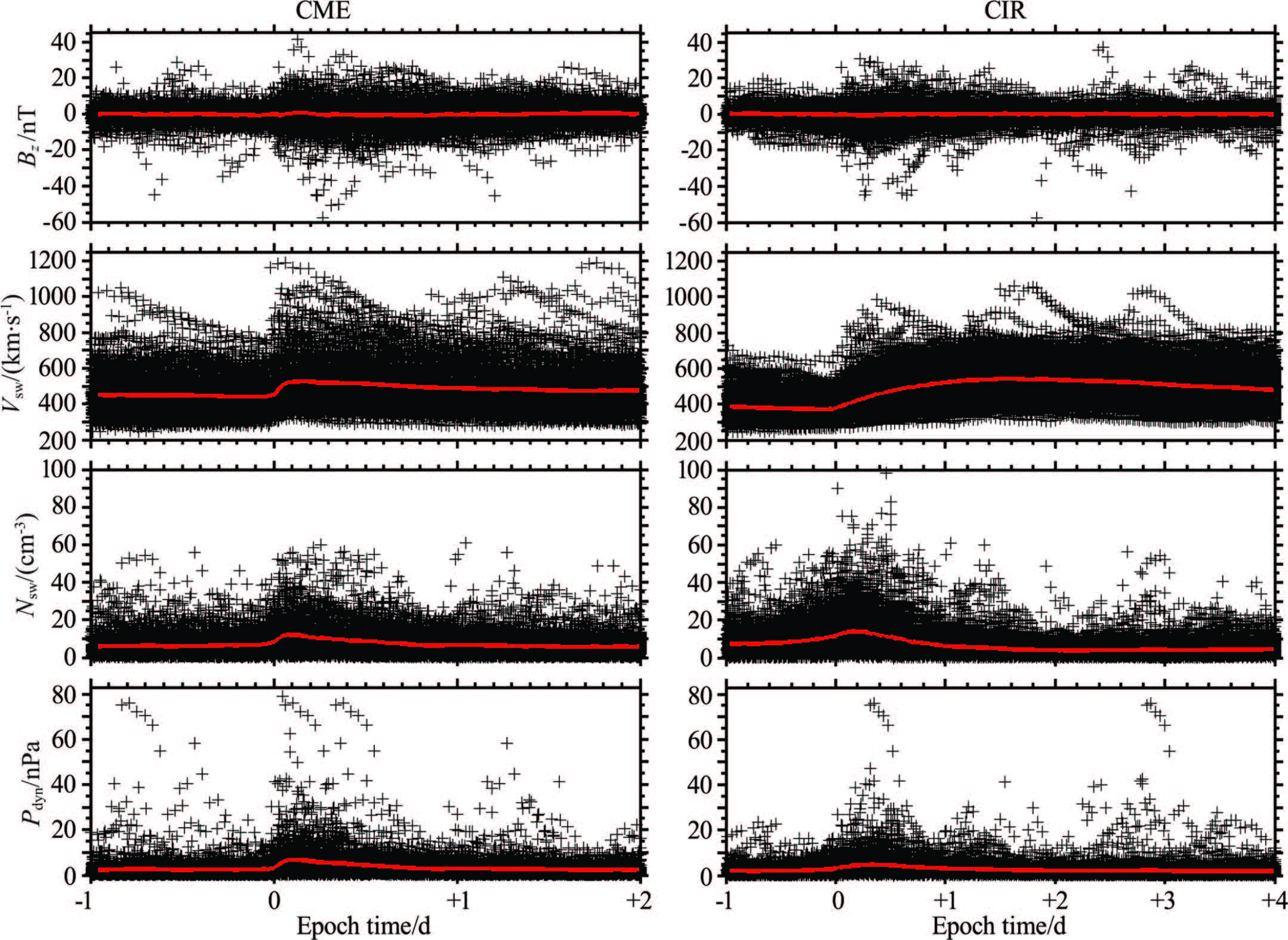 Figure 2 gives the results of solar wind parameters for all CME and CIR events during 23rd solar cycle(include IMF Bz, solar wind speed, solar wind proton density, and solar wind dynamic pressure)using superposed epoch analysis. The black “+” represents each point of CME and CIR events, and the red line represents the mathematic averages of the temporal variations. Statistically, IMF Bz, solar wind speed and solar wind dynamic pressure for CME events have a larger range than CIR events, but the solar wind proton density for CIR events has a larger range than CME events. For example, solar wind speed of some CME events can be larger than 1000 km·s-1, but CIR events is always less than 1000 km·s-1. The number of CME events with solar wind dynamic pressure peaks >30 nPa is much larger than that of CIR events. The proton densities for all CME events are less than 60 cm-3, but they can reach as large as 100 cm-3 for CIR events. The results of superposed epoch analysis show that the differences of statistically averaged IMF Bz between CME and CIR events are small. Although the solar wind speed shows obvious increase for both CME and CIR events, the former is much faster and decrease substantially within a few hours, while the latter increase slowly within one or two days after zero epoch. In addition, the statistically averaged dynamic pressures of CME events change more distinctly than CIR events, while the proton densities of CIR events are more variable.