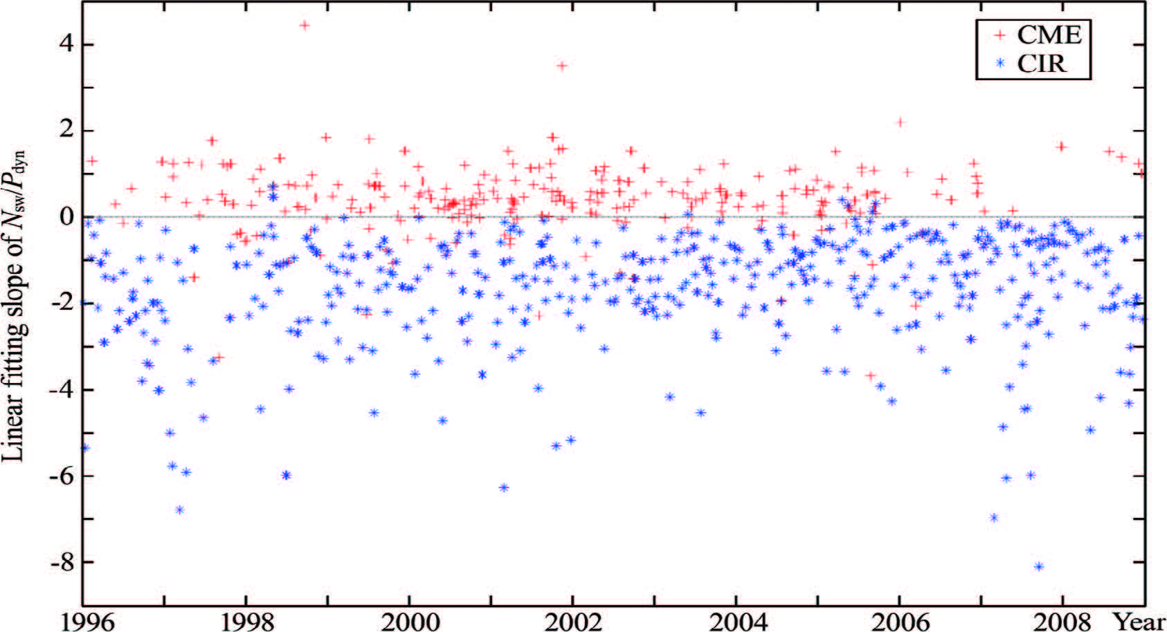 Based on the results of superposed epoch analysis given by Fig. 2, the relation between Nsw and Pdyn for all CME and CIR events during 23rd solar cycle has been analyzed: using Nsw divided by Pdyn, then the slope of Nsw/Pdyn changing with time is obtained through linear fitting, and the fitting area is the whole duration of CME or CIR events after zero epoch. Fig. 4 gives the distribution of linear fitting slope of Nsw/Pdyn of all the CME and CIR events. The red “+” represents CME and the blue “*” represents CIR.