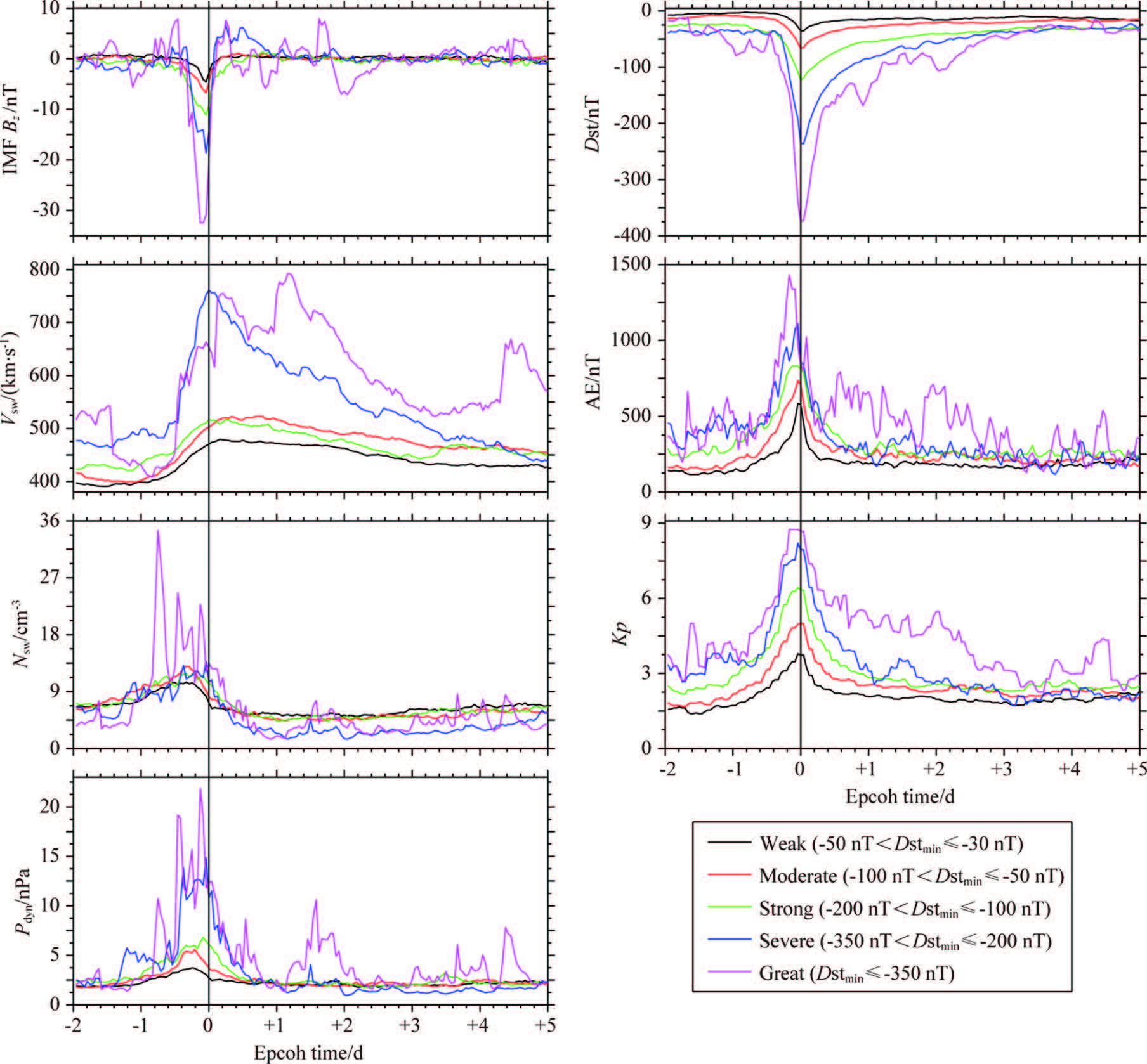 Using superposed epoch analysis to analyze the main solar wind parameters and geomagnetic indices of every class of geomagnetic storms, the zero epoch is set to the time of the minimum in Dst(i.e., the peak of magnetic storm main phase), and the seven days data include two days before the zero epoch and five days after. The mean results are shown in Fig. 5. It is observed that Dst decreases fast during the main phase. When the magnetic storm becomes more intense, Dst decreases faster and the duration of the recovery phase is longer. Overall, the different classes of magnetic storms have similar variations of Dst and the results of other six indices are similar. It is noted that because of lack of samples of great storms, the variation is large even after superposition averaging.