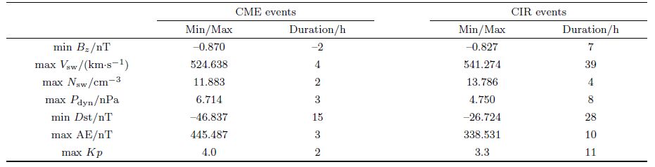Table 1 gives the mean maximum(minimum)of IMF Bz, solar wind speed, solar wind proton density, solar wind dynamic pressure, Dst, AE and Kp and the time relative to zero epoch when arriving at the maximum/ minimum value. For CME events, each considered parameter approaches the mean maximum(minimum)quickly after the start time. But for CIR events, the parameters require a longer time to reach the maxima(minima). Table 1 tells that on average CME events have larger southward IMF Bz, solar wind dynamic pressure, AE, Kp and smaller Dstmin, which means that CME events are generally more severe than CIR events and their driven magnetic storms and substorms are much stronger(Denton et al., 2006). But for CIR events, solar wind speed and solar wind proton density have larger maxima, because CIR events are closely connected with high speed proton fluxes.