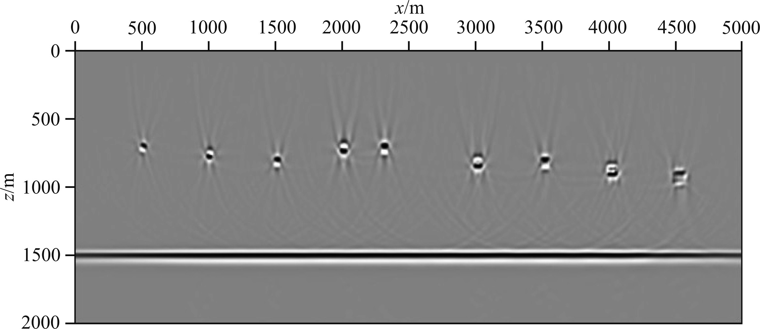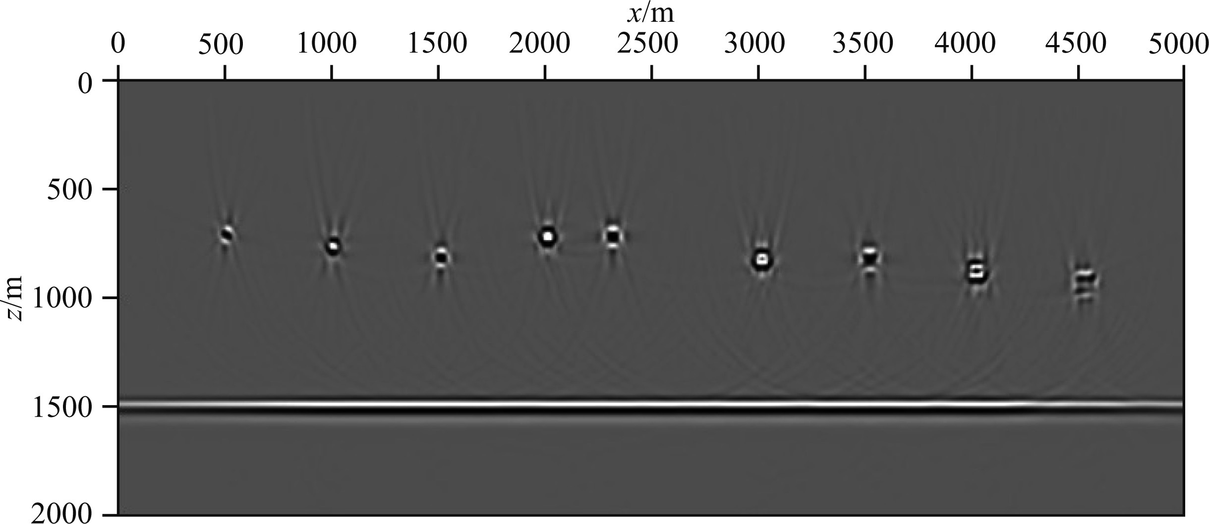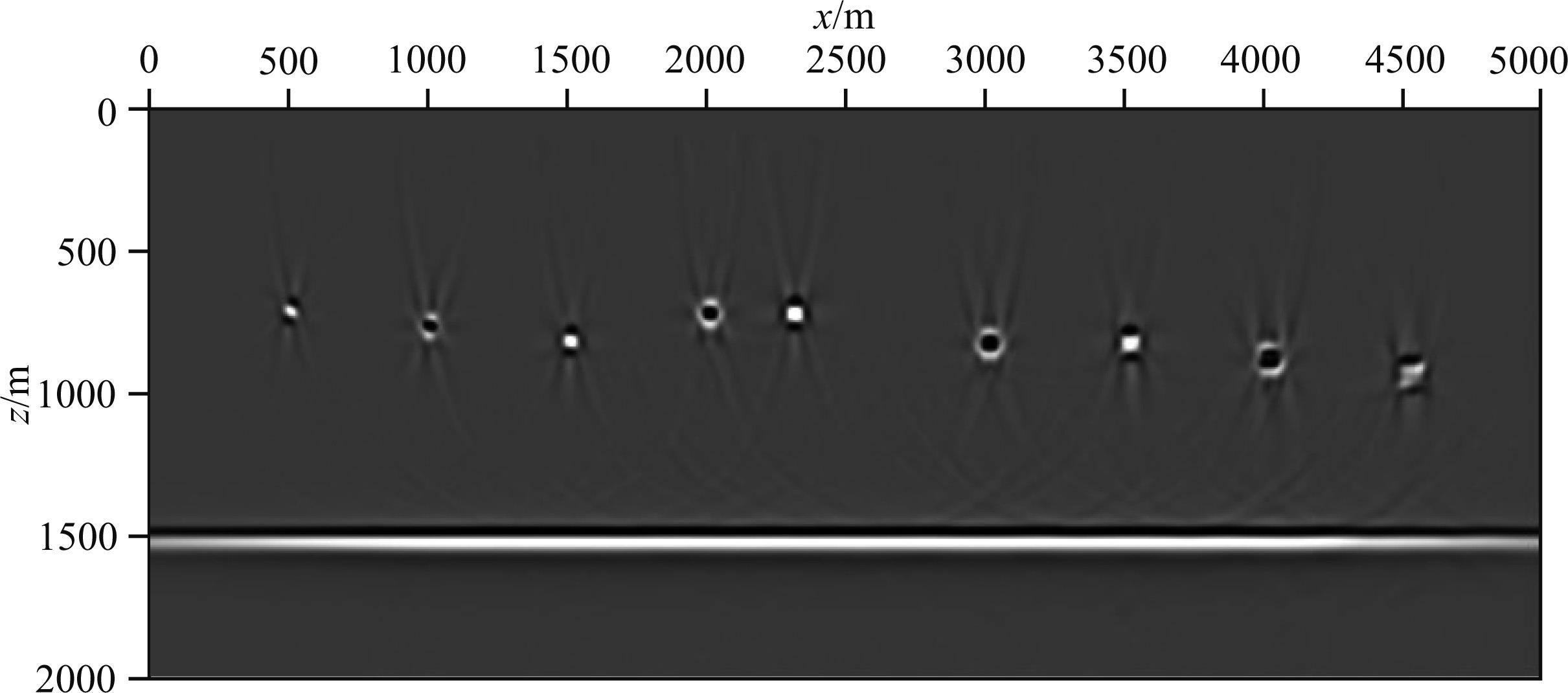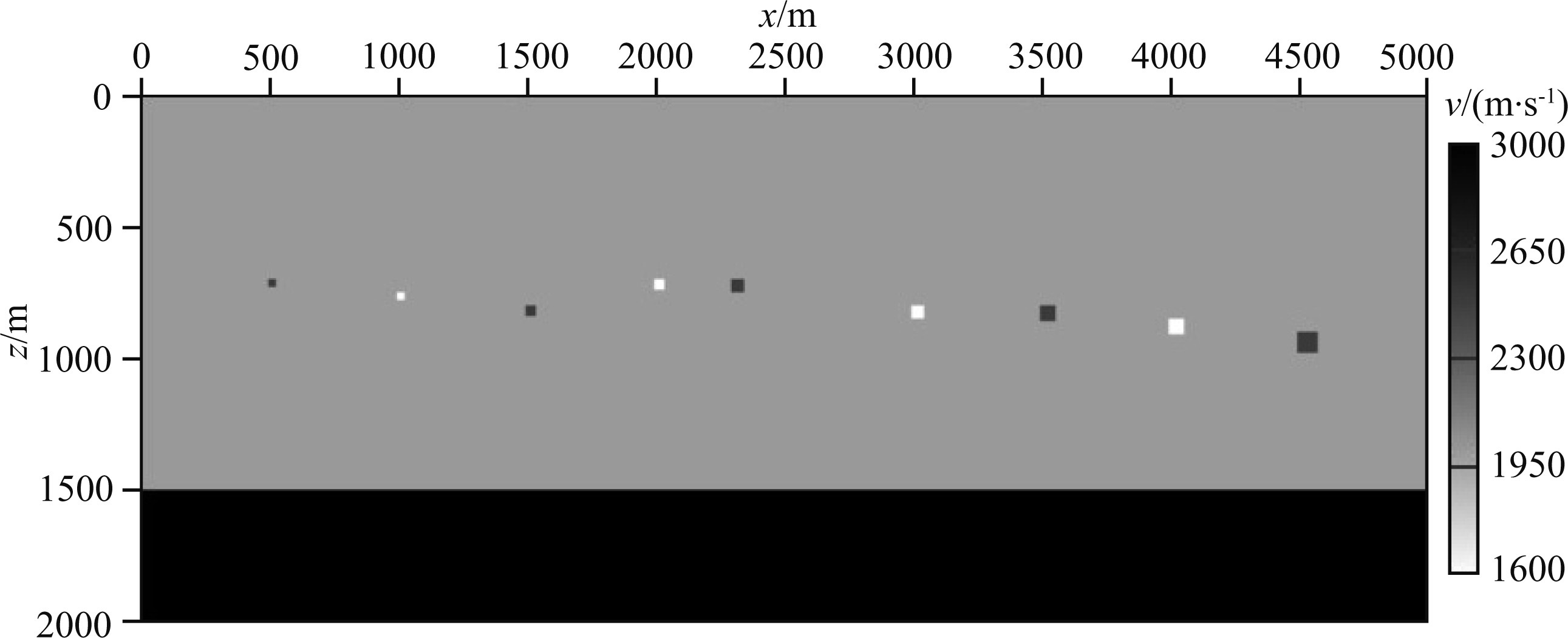 3.1 Simple Model TestFigure 1 is the velocity model. This model contains nine different size high-speed and low-speed scatterers and one horizontal reflector,which can be used to verify the effect of scattered wave migration and reflected wave migration respectively. The model is 5 km in length and 2 km in depth,grid spacing is 10 m in both directions. There are 5 high speed scatterers whose size from left to right respectively is three,four,five,six and eight grid points (number 1,3,5,7,9 black scatterer in Fig. 1) . All the high-speed scatterers' velocity is 2500 m·s-1. Four low-speed white scatterers with velocity 1600 m·s-1 are arranged left-to-right,whose size respectively is three,four,five and six grid points. The first layer is 2000 m·s-1, and the second layer is 3000 m·s-1,the velocity interface is at 150 grids point in depth. 250 shots are fired with a middle shooting and both sides receiving spread geometry. The shot interval is 20 m and each shot is recorded by 401 receivers with a 10 m receiver interval and 0 m minimum offset. A Ricker wavelet with a 20 Hz peak frequency is used as the source wavelet, and the record length is 2.5 s,the time sampling rate is 1 ms.