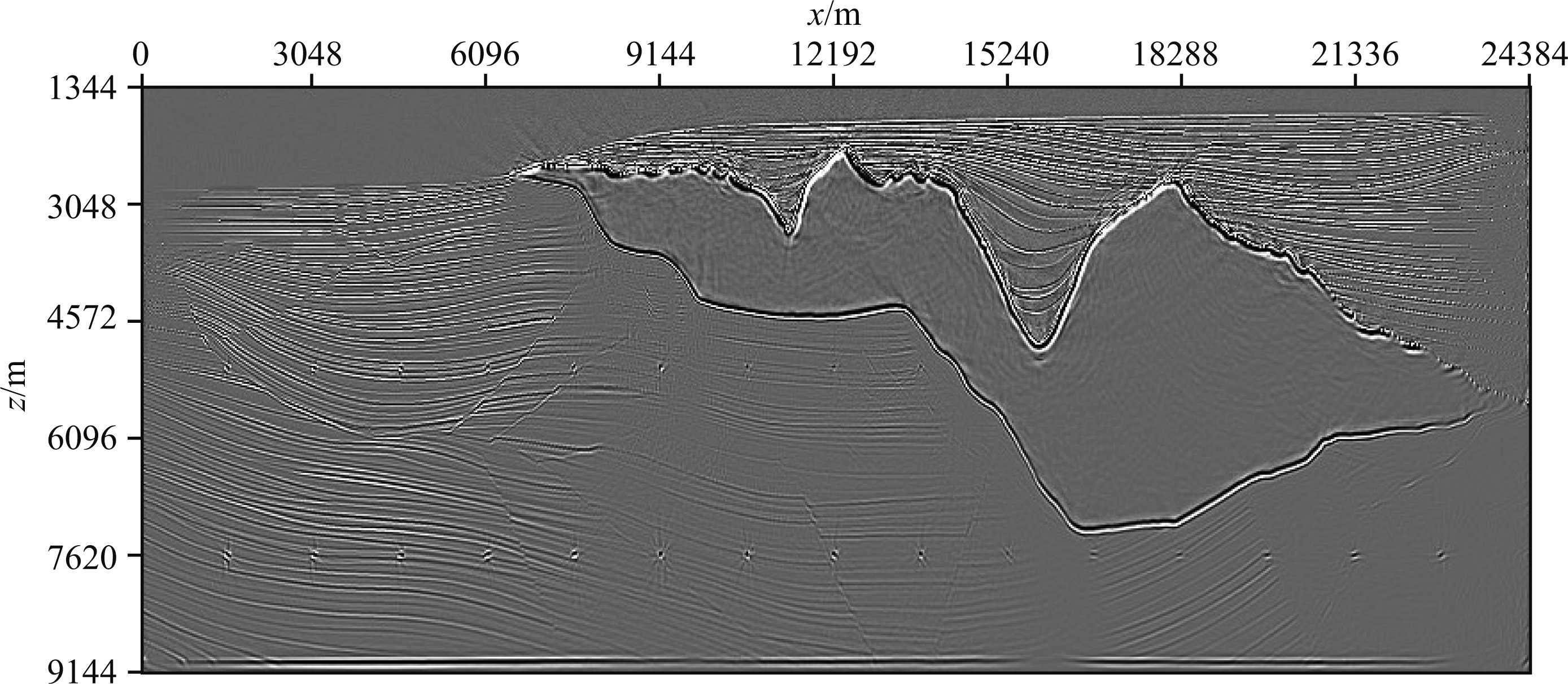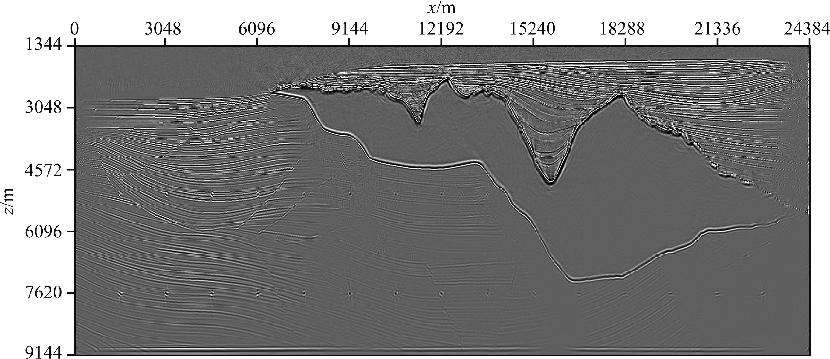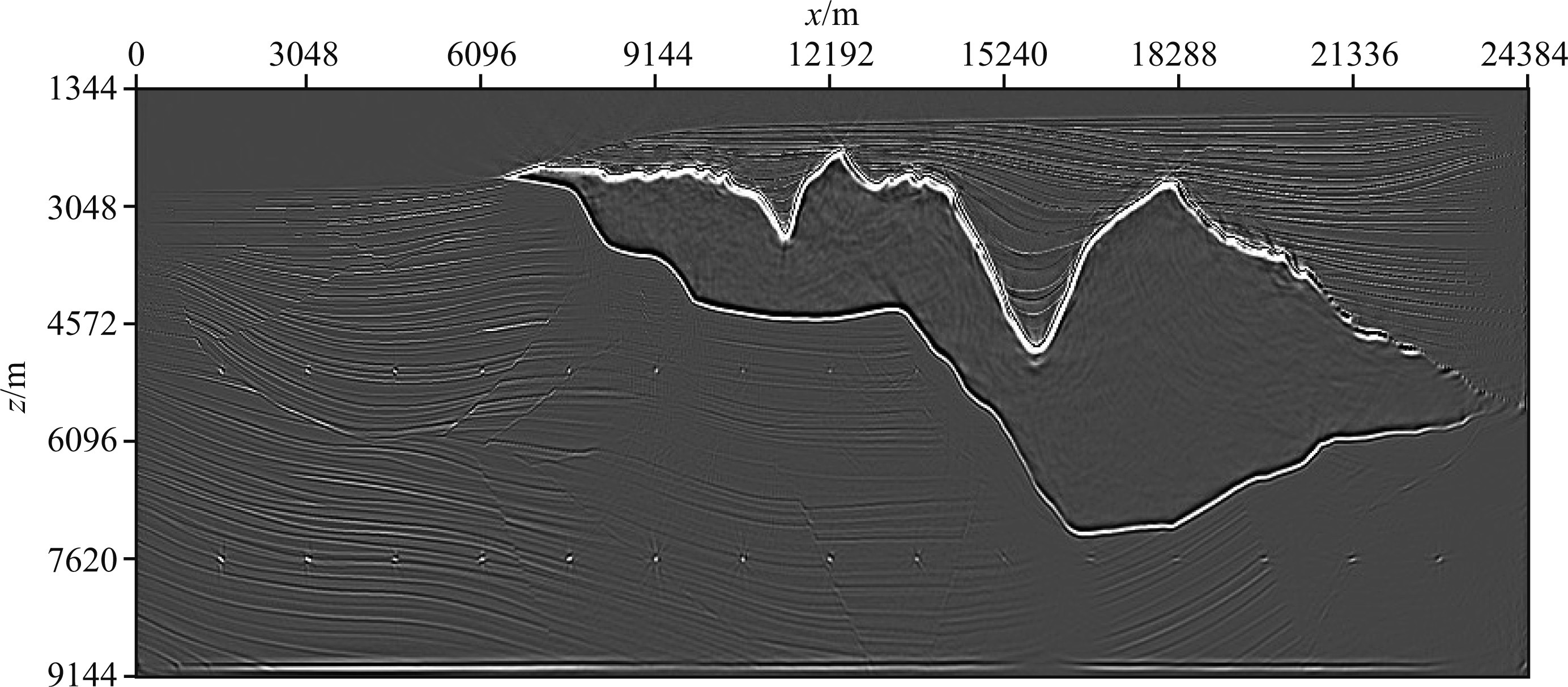 An international st and ard Sigbee2A model data is used to further verify the proposed scattering migration and reflection migration method. This model contains high-speed salt,subtle reflector and many high-speed scatterers,which is suitable for our test. Fig. 6 is the background velocity model with 3201 grid points horizontally and 1201 grid points in depth. The grid interval of both directions is 7.62 m. Marine towing observation system is used to generate synthetic seismic data. The seismic data contains 500 shots with 45.72 m shot-interval and each shot is recorded by different number of receivers with 22.86 m interval,at least 57,up to 348. The towing length is 7932.42 m. The time interval is 8 ms and time sample points is 1500.