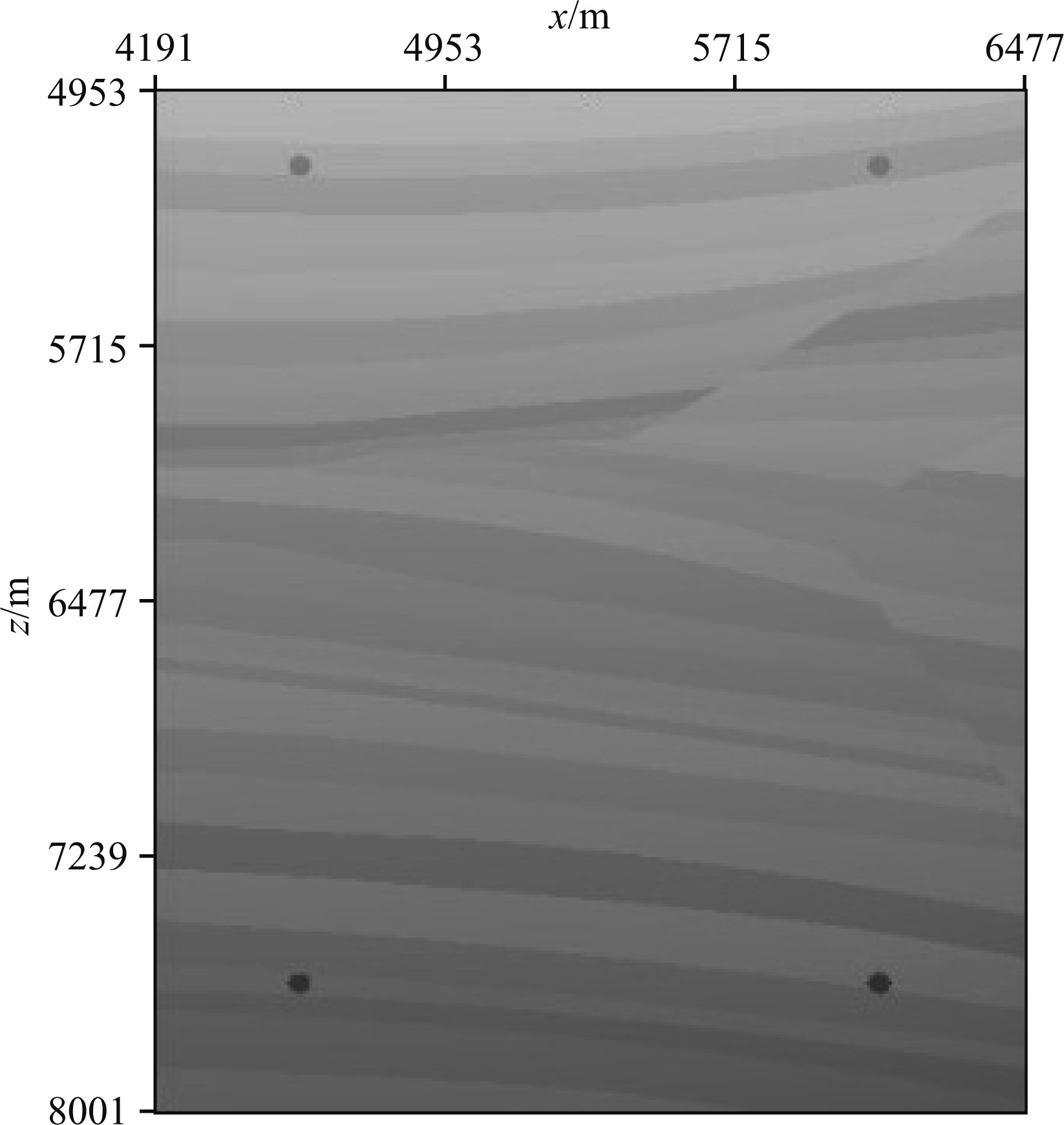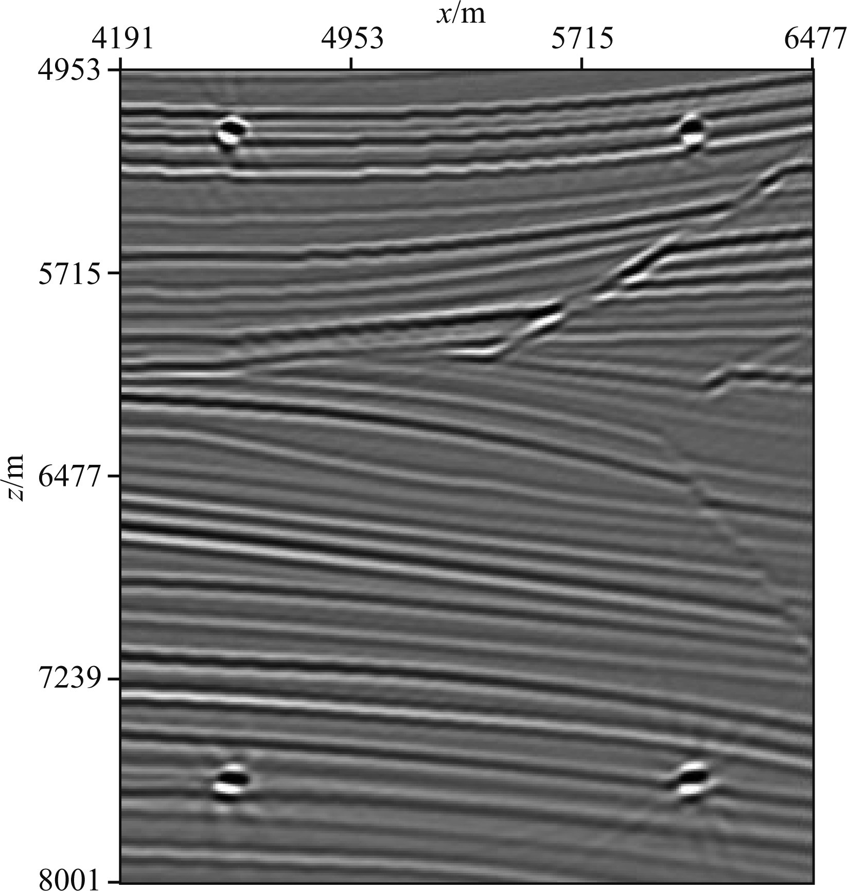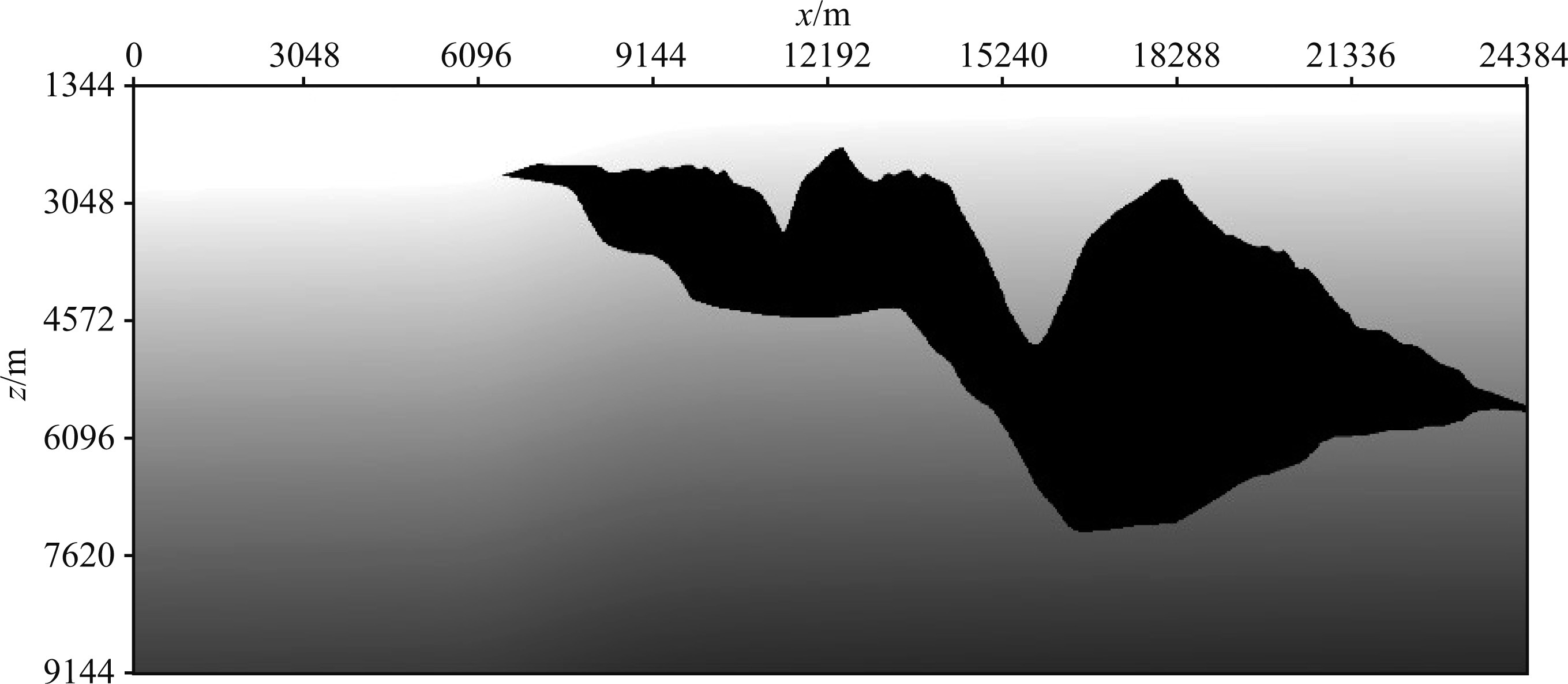 An international st and ard Sigbee2A model data is used to further verify the proposed scattering migration and reflection migration method. This model contains high-speed salt,subtle reflector and many high-speed scatterers,which is suitable for our test. Fig. 6 is the background velocity model with 3201 grid points horizontally and 1201 grid points in depth. The grid interval of both directions is 7.62 m. Marine towing observation system is used to generate synthetic seismic data. The seismic data contains 500 shots with 45.72 m shot-interval and each shot is recorded by different number of receivers with 22.86 m interval,at least 57,up to 348. The towing length is 7932.42 m. The time interval is 8 ms and time sample points is 1500.