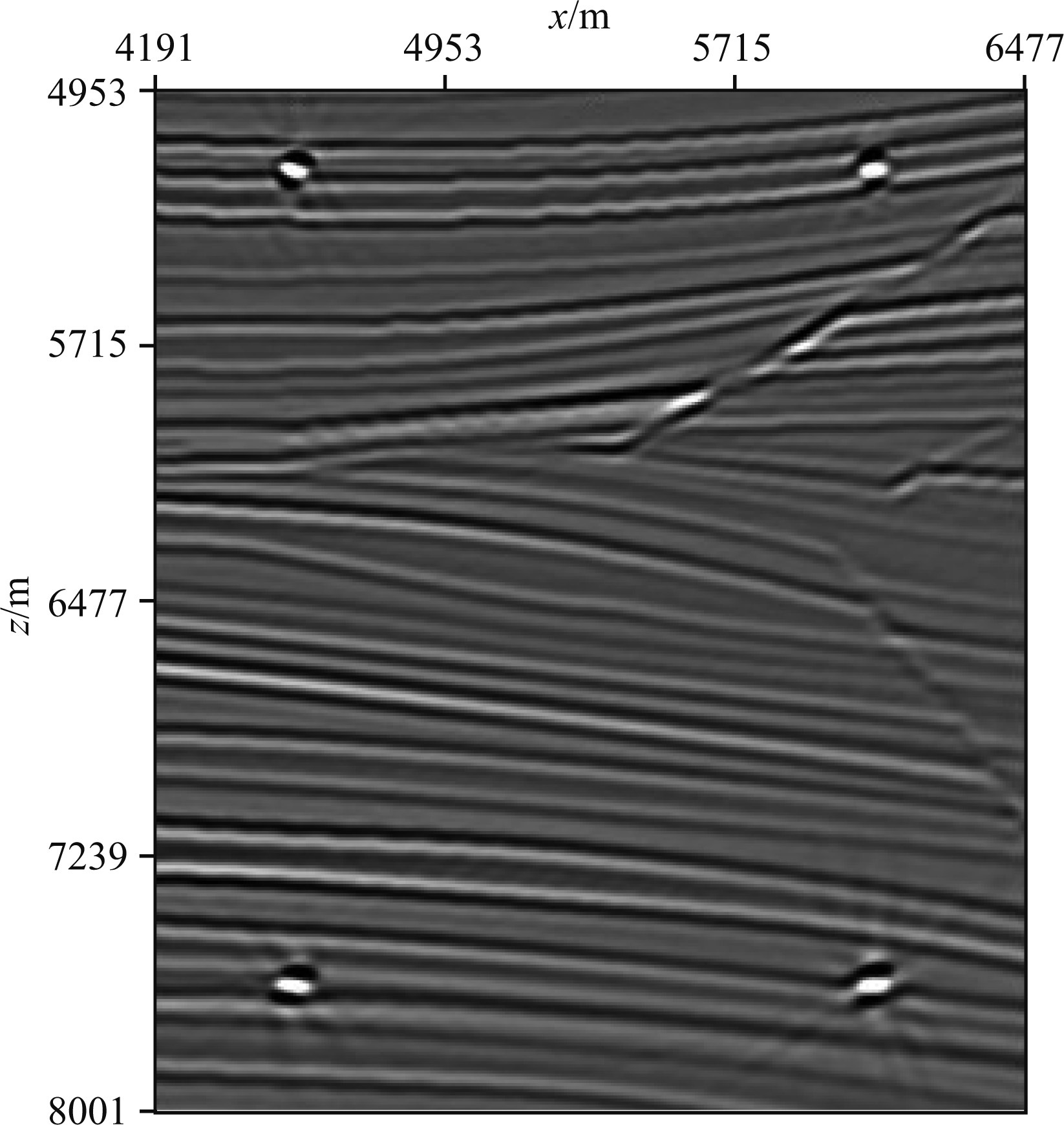 By comparison,the main difference between the reflected data migration proposed in this paper and the conventional migration is the imaging equation,which is the difference between Eqs. (34) and (39) . Compared with conventional migration image,reflected migration image has 90° phase shift due to the first order time derivative terms in the source wavefield. What's more,derivative operation can improve the image's resolution. Thus for reflected wave migration,we suggest to apply the reflected wave migration method proposed by this paper,because Claerbout's migration method not only has 90° phase error,leading to inaccurate imaging position,but also results in lower-resolution image.