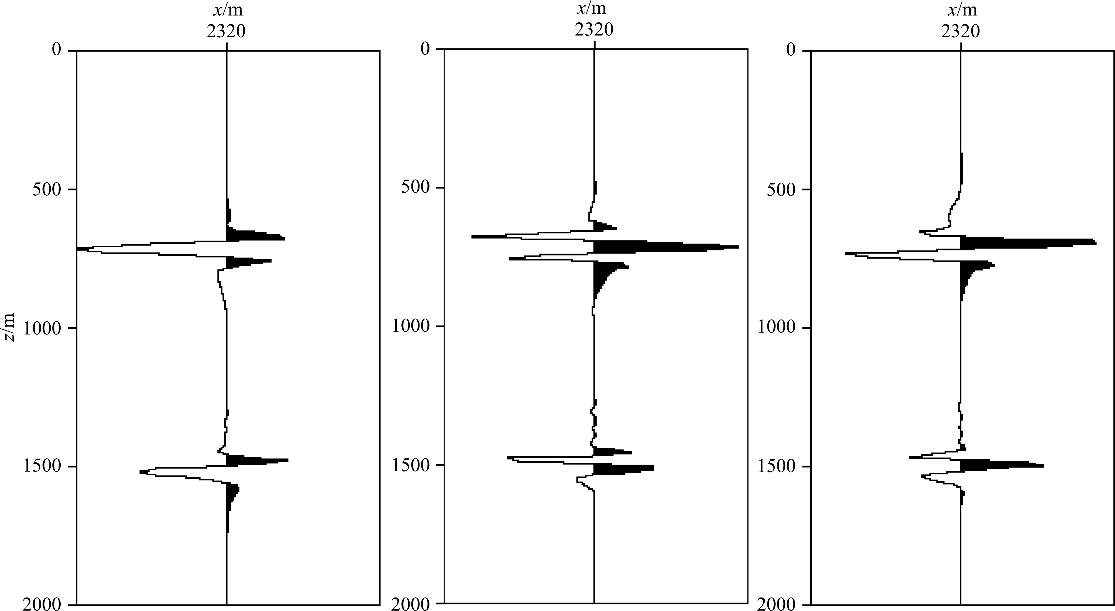Comparing Figs. 2,3, and 4 with Fig. 1,it is clear that as for the imaging of scatterers,the imaging quality in Fig. 3 is the best,it not only has high resolution,but also correct phase position. Although the result in Fig. 2 got the right location,it has low resolution and 180° phase error,or reversed polarity,which means that the five high-speed scatterers 1,3,5,7, and 9 in Fig. 1 are imaged as low-speed scatterers and the four low-speed scatterers are imaged as high-speed scatterers. The imaging result in Fig. 4 has 90° phase error,leading to incorrect imaging location. However,for the imaging of reflection,the result in Fig. 4 is the best,not only has high resolution,but also right phase and position,the reflection imaging result of conventional migration in Fig. 2 has a 90° phase error, and the result in Fig. 3 also has a -90° phase error,both resulting in wrong positions. In order to further compare the resolution,phase and imaging position of those three methods,we plot the 232nd trace of above three migration results,which crosses the fifth scatterer and the reflector. In Fig. 5,the left picture is conventional migration result,the middle is scattered wave migration result and the right is reflected wave migration result. From the waveforms in Fig. 5,it is clear that the result from scattering migration method can get the right position and correct polarity of the crest indicating a high-speed scatterer. Meanwhile,the reflection migration method also does well in reflector imaging. It can image at the correct position with high resolution and the image has right polarity of the crest indicating a high-speed reflector. But the conventional migration image has phase error for both scatter and reflector. Its image result has 180° phase error for scatterer,which changes the high-speed scatterer into low-speed scatterer, and has 90° phase error for reflector,which results in incorrect image position and low resolution. The numerical result of this model consists with the theoretical result of this paper.