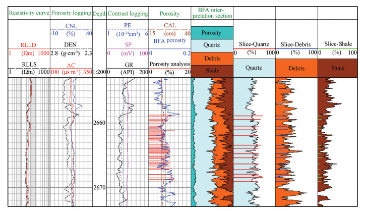 Figure 8 shows the results of the BFA algorithm after solving the optimization logging interpretation method of the unknown reservoir parameters. It was found that when using BFA algorithm alone to solve each of the reservoir parameters the curves presented more burrs. This was caused by the slow convergence rate in the later stage of the BFA algorithm. Fig. 9 shows the results of the BFA-CM hybrid algorithm in solving the optimization logging interpretation method of the unknown reservoir parameters. The BFA-CM hybrid algorithm overcame the shortcomings of the BFA algorithm, and improved the convergence rate in the later stage of BFA algorithm. The calculated results were found to be in agreement with the core and slice analysis data, and the porosity and curve of each component’s content were more stable.