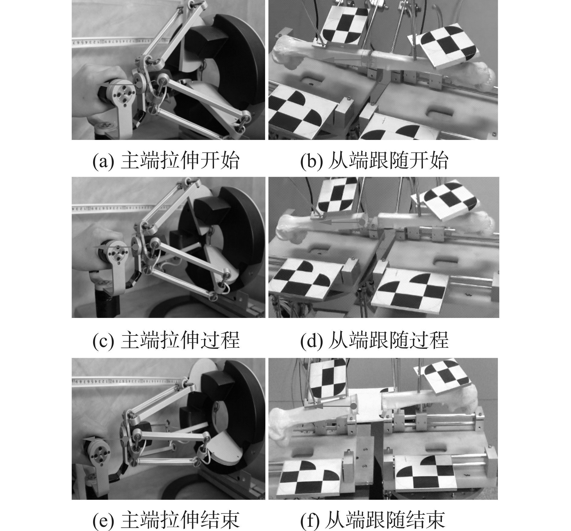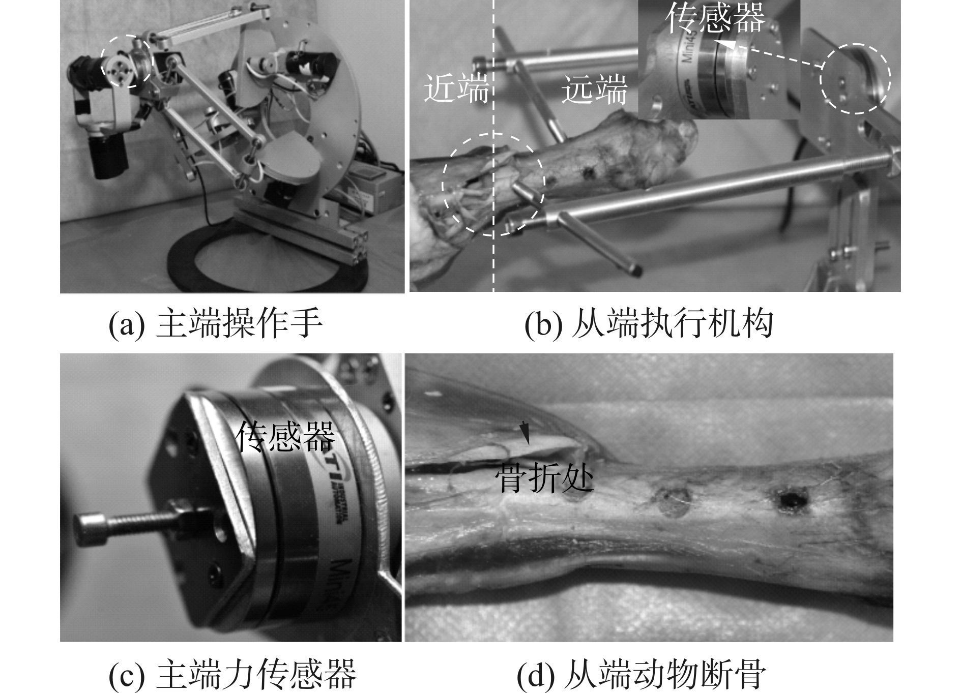 为了测量拔伸过程中肌肉的拮抗力和主端反馈力,在断骨的末端和主操作手动平台上都安装了力传感器,验证机器人辅助骨科复位手术中的力跟踪性能,如图 15和图 16所示。