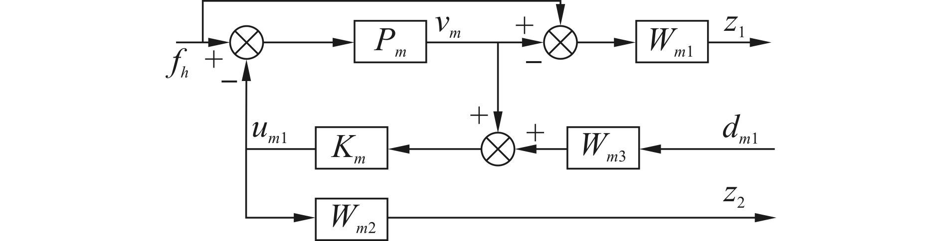 | $\eqalign{ & z = \left[ {\matrix{ {{W_1}\left( {{v_m} - {v_s}} \right)} \cr {{W_2}[{f_s} - \left( {{u_{m1}} + {u_{m2}}} \right)} \cr {{W_3}{u_{m2}}} \cr \matrix{ {W_4}{u_{s2}} \hfill \cr {z_5} \hfill \cr} \cr } } \right] \cr & w = \left[ {\matrix{ {{f_h}} \cr {{f_b}} \cr {{w_3}} \cr } } \right],y = {f_s},u = \left[ \matrix{ {u_{m2}} \hfill \cr {u_{s2}} \hfill \cr} \right] \cr} $ | (20) |