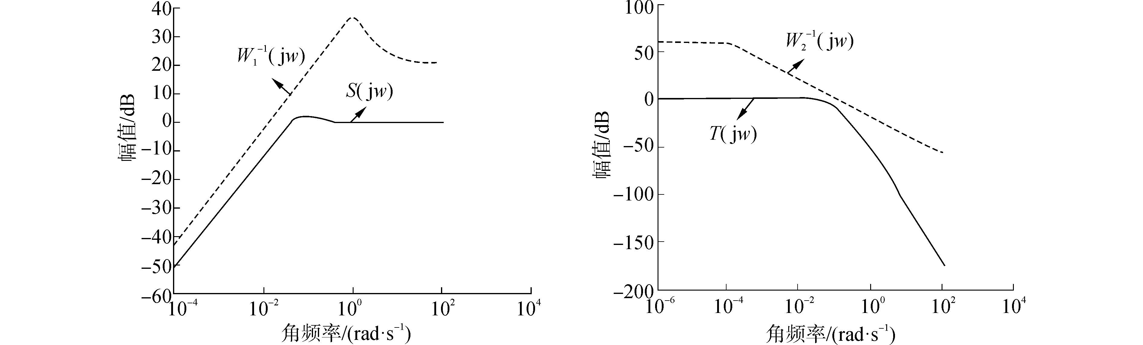 | 图6 灵敏度、补灵敏度及加权函数倒数的幅频图 Figure 6 Frequency characteristic diagram of the sensitivity function,complementary sensitivity function and reciprocal of weighted functions |