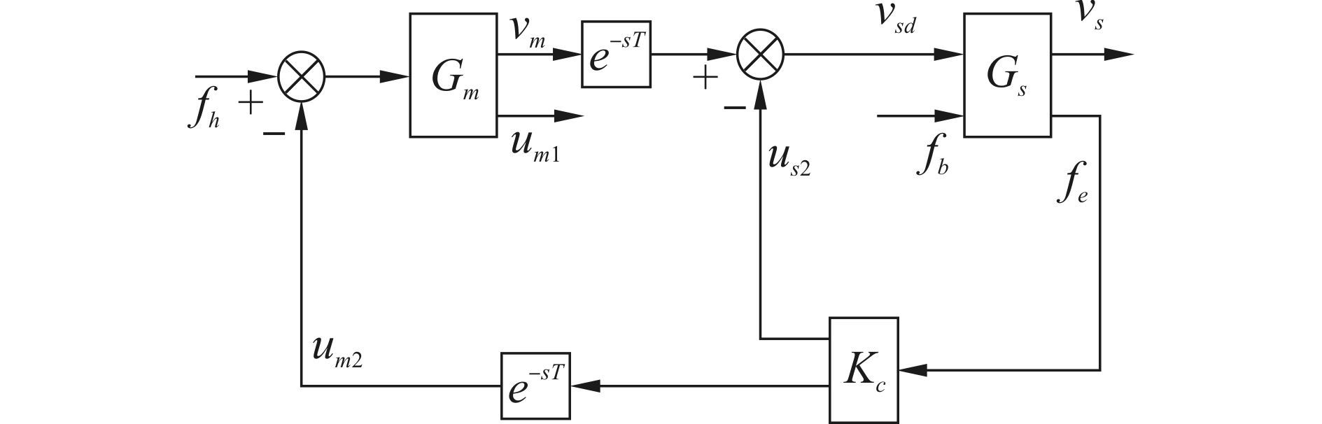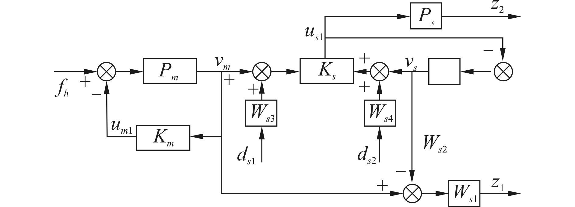 | $\begin{align} & z=\left[ \begin{matrix} {{W}_{s1}}\left( {{v}_{m}}-{{v}_{s}} \right) \\ {{W}_{s2}}{{u}_{s1}} \\ \end{matrix} \right],w=\left[ \begin{matrix} {{f}_{h}} \\ {{d}_{s1}} \\ {{d}_{s2}} \\ \end{matrix} \right] \\ & y=\left[ \begin{matrix} {{v}_{m}}+{{W}_{s3}}{{d}_{s1}} \\ {{v}_{s}}+{{W}_{s4}}{{d}_{s2}} \\ \end{matrix} \right],u={{u}_{s1}} \\ \end{align}$ | (15) |