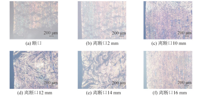 由图 8可知:当应变速率为8.33×10-7 s-1时,断口在焊缝和热影响区,无缩颈现象,为脆性断裂。可以看到断口附近形变巨大,离断口越近形变越大,远离断口形变变小。同时在焊接区和母材区能看到大量裂纹,在焊缝和热影响区,裂纹粗大,裂纹方向与形变方向一致。焊缝和热影响区之外,裂纹细小,裂纹方向与拉伸应力方向垂直。且离断口越近,裂纹的宽度和长度越大,裂纹密度也越高,反之,离断口越远,裂纹的宽度和长度越小,裂纹的数目也越低。标距区之外基本上无裂纹。