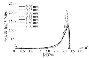 | 图10 不同流速条件下立管的最大弯曲应力 Fig.10 Max bending stress of SCR under different current velocities |