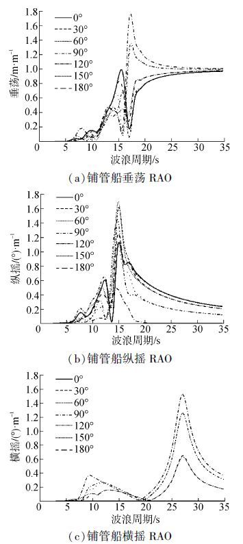 | 图11 铺管船垂荡、纵摇和横摇RAO Fig.11 Heave and pitch RAOs of J lay barge |