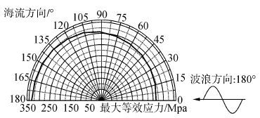 | 图5 不同海流方向下立管的最大等效应力 Fig.5 Max von Mises stress of SCR under different current directions |