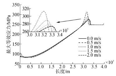 | 图9 不同流速条件下立管的最大等效应力 Fig.9 Max von Mises stress of SCR under different current velocity |