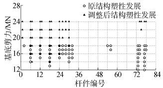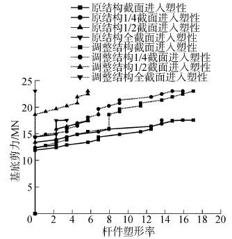 对调整后结构进行冰工况下的推覆分析,载荷方向分别为45°和90°。90°方向下的塑性发展过程如图9所示。从结果可以看出,结构中首个进入塑性的构件位置发生变化,当基底剪力达到14×103 kN时,6号和18号腿柱开始进入塑性;当基底剪力达到16×103 kN时12和24号腿柱开始进入塑性;其后,26号和30号外围横撑出现塑性;当基底剪力达到24×103 kN时,74、77和78号斜撑构件出现塑性。为进一步分析结构构件进入塑性程度,以栅点处不同程度进入塑性杆件占总杆件数的比值作为杆件塑性率,原结构与调整后结构杆件塑性率如图10所示。可以看出,对于调整后结构,在极限状态下1/4截面进入塑性的杆件率增大2.3%,全截面进入塑性的杆件率降低2.3%。调整后能更好地发挥构件的承载能力,而全截面进入塑性的杆件比率降低可保证结构具备更好的极限储备。