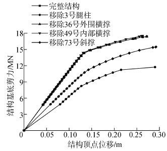 为研究不同类型构件对剩余结构的影响,分别取移除3号腿柱、移除36号外围横撑、移除57号内部横撑和移除73号斜撑结构与完好结构进行对比分析。在90°方向冰工况载荷作用下,完好结构和移除构件后剩余结构的基底剪力与顶点位移如图5所示。横撑构件的重要性指标较小,对应的基底剪力与顶点位移基本没有变化。完好结构弹性阶段斜率为1.10×105 kN/m,移除73号斜撑后结构弹性阶段的斜率为8.2×104 kN/m,结构刚度降低25.5%;移除3号腿柱后剩余结构弹性阶段的斜率为6.3×104 kN/m,结构刚度降低42.7%。