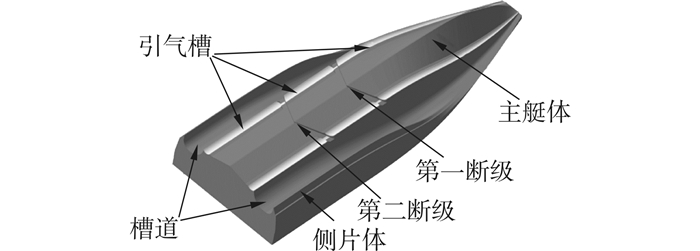 1 数值船池的建立及有效性验证 1.1 模型简介本文所研究的三体滑行艇模型如图 1所示,引气槽设于主体舭部,在纵向上由艇艏至艇艉贯穿全艇,并在断级处断开;在断级之后,引气槽具有相同的拱度。该模型已在中航工业第605研究所高速水池进行了静水拖曳试验,表 1中给出了模型的主要尺度参数。