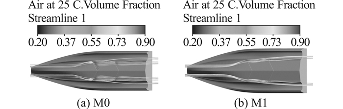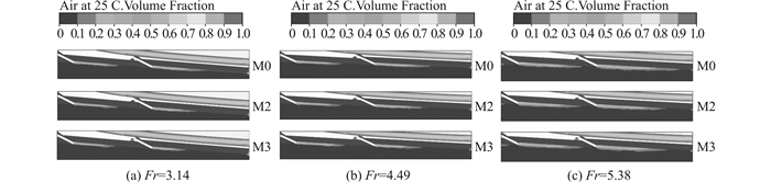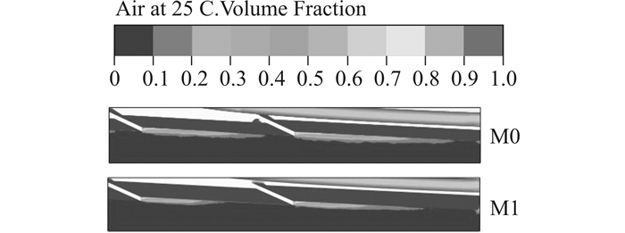 同时从空气体积分数的分布上可以看出,引气槽末端的来流以空气为主,而部分来流中的空气将在横向流动的影响下进入艇底的空穴,就好像引气槽将来流的中空气输入到空穴内。图 10给出了Fr=5.83时断级后空穴形态的对比,可以看出由于引气槽额外向断级后部输入空气,M0的空穴较M1有了明显的增大,相应的断级后滑行面的浸湿面积也更小,其减阻效果也更加的明显。