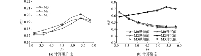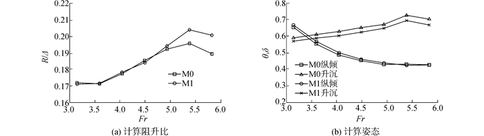 | 图 7 M0与M1的计算阻力、姿态 Fig. 7 Computational resistance, trim angle and sinkage of M0 and M1 |