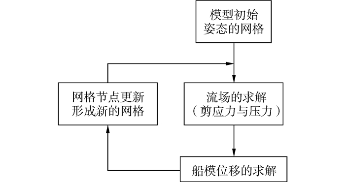 实际的求解为一耦合迭代过程,如图 2所示,通过对初始模型流场的求解,得出剪应力场与压力场的变化,由(1)式和(2)式得出合力与力矩,带入(3)、(4)两式积分即可得出模型位移,之后则根据模型位移更新网格节点坐标,进行新的流场的求解。经过一定的耦合迭代过程之后,所得出的相对稳定的外力与姿态,即是该工况下模型稳定航行时的外力与姿态。