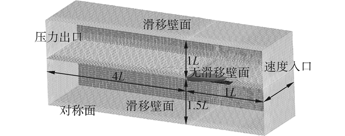 图 3中给出了数值计算中所使用的计算域的范围及边界条件的设置,考虑到流动的对称性,计算域只针对半艇体进行建立。整个计算域采用结构与非结构的混合型网格进行划分,如图 4所示,采用三角形的面网格完成模型复杂几何外形的捕捉,将面网格拉伸所形成的棱柱形网格作为边界层网格,近艇体壁面区域以四面体网格进行填充,远场区域则以结构化的六面体网格进行划分。总网格数量为8.1×104,yplus值范围为70~300。