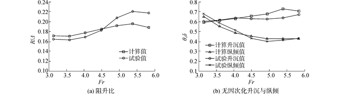 本文的研究对象包括多个具有不同外形特征的三体滑行艇模型,为了能够清晰的捕捉到各模型水动力特性的差异,要求以上计算方法应具有一定的精度。本文中以图 1中所给出的原始模型的试验数据作为依据对计算方法的精度进行了验证。本文中对试验及计算数据均进行了无量纲化处理,其中无量纲化的航速与阻力分别以容积傅汝德数Fr和阻升比R/Δ表示,无量纲化的升沉与纵倾定义如下: