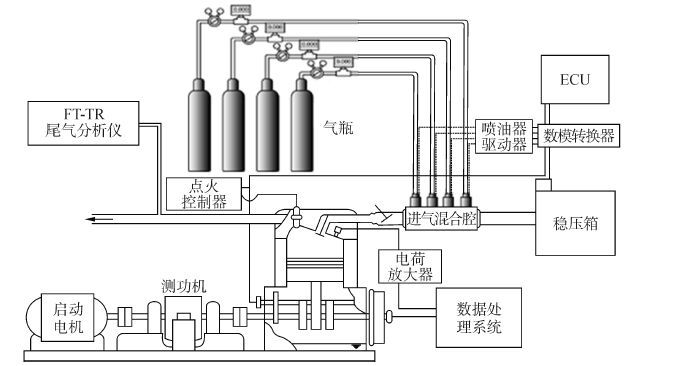 试验中,采用瓶装压缩气体模拟实际生物质燃气,通过改变燃料混合比及CO2含量来改善发动机的工作稳定性。试验中保持发动机转速1 500 r/min、最佳点火提前角(MBT)以及节气门全开(WOT)条件不变。试验系统图如图1所示。