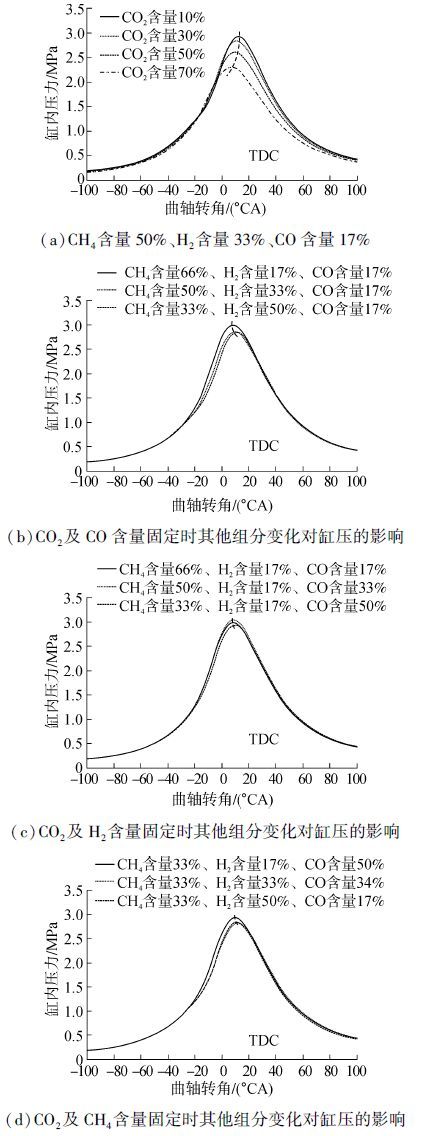 2 试验结果与分析 2.1 组分变化对缸内压力的影响图2所示为不同组分条件下的缸压数据。