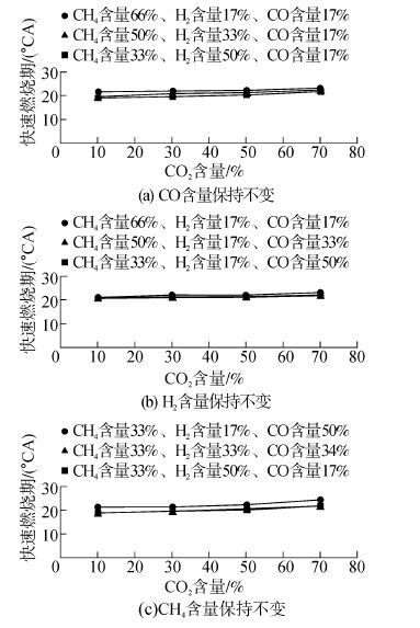 图4~5所示为快速燃烧期和火焰发展期在不同气体组分、CO2含量条件下的变化情况。本文定义累积放热率0~10%对应的曲轴转角为火焰发展期,累积放热率10%~90%对应的曲轴转角为快速燃烧期。在所有燃料组分条件下,火焰发展期及快速燃烧期均随CO2含量的增加而延长,但变化幅度不同。如图4所示,分别为保持CO含量、H2含量及CH4含量不变,而改变另外两种燃料体积分数的情况。在CO2含量保持不变的前提下,当H2含量一定时快速燃烧期随CO含量及CH4含量的变化并不明显;而当CH4含量或CO含量一定时,快速燃烧期随H2含量的增加而明显缩短。三种可燃组分相比,H2的燃烧速度远高于CH4及CO,CH4及CO的燃烧差异较小,因此快速燃烧期随H2含量的增加而有较明显的缩短,而CH4含量及CO含量的变化对快速燃烧期没有明显影响。快速燃烧期随CO2含量增加略微延长,但延长幅度不大。当燃烧进入快速燃烧阶段时,缸内湍流对火焰传播速度及燃烧进程起主要作用[11]。因此如图4所示,CO2含量的增加对快速燃烧期的影响并不明显。