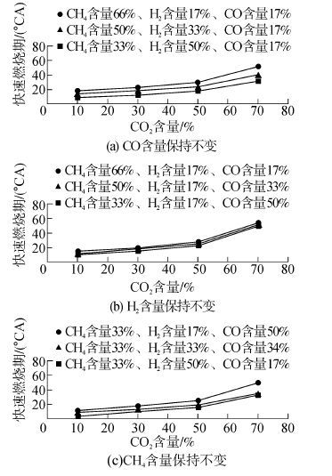 火焰发展期及快速燃烧期的变化趋势对比表明,本试验所涉及的生物质燃气组分中的H2含量及CO2含量对燃烧持续期的影响作用显著。CO2含量直接影响着火过程,使燃烧初期的火焰核心形成延迟,但一旦形成稳定火焰核心之后,组分对燃烧过程的影响作用不再占据主要地位。