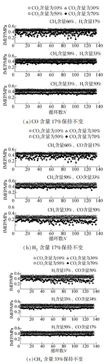 在图7(a)和(c)中,随着H2含量的增加,IMEP散点分布区间明显减小。当H2含量达到50%时,IMEP散点分布已十分稳定,此时CO2含量对散点分布范围的影响已不显著。在图7(b)中,H2含量保持在17%的较低水平,CH4含量及CO含量此消彼长,此时IMEP散点分布范围与燃料混合比的影响不大,CO2含量对其影响其主要作用。在不同燃料条件下IMEP散点的分布范围差异是由于CH4、H2及CO的燃烧速度差异造成的。H2的燃烧速度远高于CH4及CO,H2含量较高时对应的初燃期火焰传播较快,燃烧稳定,循环变动小,因此图7(a)及(c)的IMEP散点分布趋于集中。而CH4与CO的燃烧速度差异不大,这导致图7(b)中IMEP散点分布范围与燃料混合比的相关性不明显,主要受CO2含量的影响。