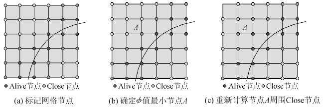 如图 1所示,交界面周围节点标记为Alive节点,与之相邻的为Close节点,其余均为Far节点;计算所有Close节点上的φ值,找到φ值最小的节点A;标记其周围Far节点为Close节点;将节点A作为Alive节点,重新计算其周围Close节点上的φ值。