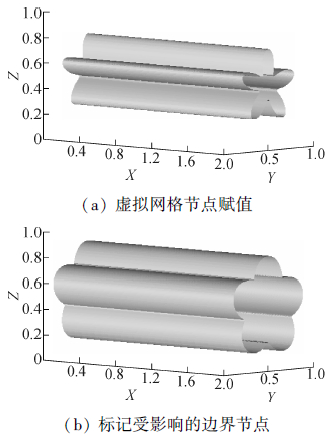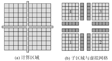 | 图2 计算网格的划分以及虚拟网格的布置 Figure 2 Partition of computational mesh and arrangement of ghost mesh |