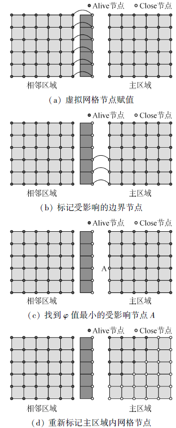 在图 3中,相邻区域右边界节点的φ值先赋给主区域虚拟网格节点;然后比较主区域边界节点和虚拟节点的φ值,标记受影响边界节点为Close节点,并更新其φ值;再找到边界上φ值最小的受影响节点A,并以节点A的φ值为阈值,重新标记主区域内所有网格节点。