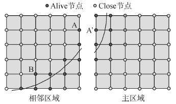 需要注意的是,由于快速步进算法不变更直接与交界面相邻的Alive节点状态,因此,在同步过程中,即使这些Alive节点的φ>φmin,也应该禁止对这些节点重新标记。如图 4所示,相邻区域节点A'为Alive节点,主区域右边界上节点A是受相邻区域的影响节点,同步过程中,节点A的φ值为标记主区域节点的阈值φmin,而Alive节点B的φ>φmin,但由于节点B的φ值是快速步进算法的边界条件,所以禁止计算流程改变其节点类型。