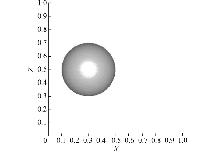4.1 圆球本算例设定计算区域大小为1×1×1,分辨率为100×100×100,整个计算区域将划分成左右两部分。圆球位于左侧计算区域,如图 5所示,其球心位置为[0.3,0.5,0.5],球体半径为0.2。