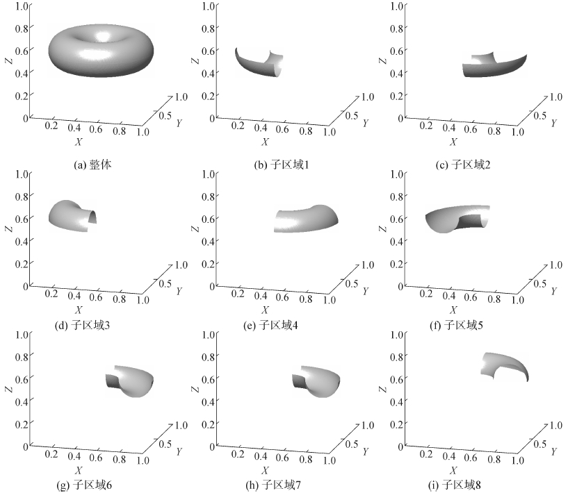 其中,R=0.3,r= 0.05。φ零等值面如图 8所示。图 9(a)给出了φ= 0.1的等值面,图 9(b)~(i)则给出了分区域计算各子区域内φ= 0.1等值面。