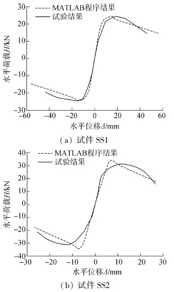 选择试件SS1和SS2的试验结果与MATLAB程序计算结果进行比较,如图 6,两根试件的具体参数见文献[2]。由图 6可知,MATLAB程序结果与试验结果符合较好,可以认为程序编制正确。