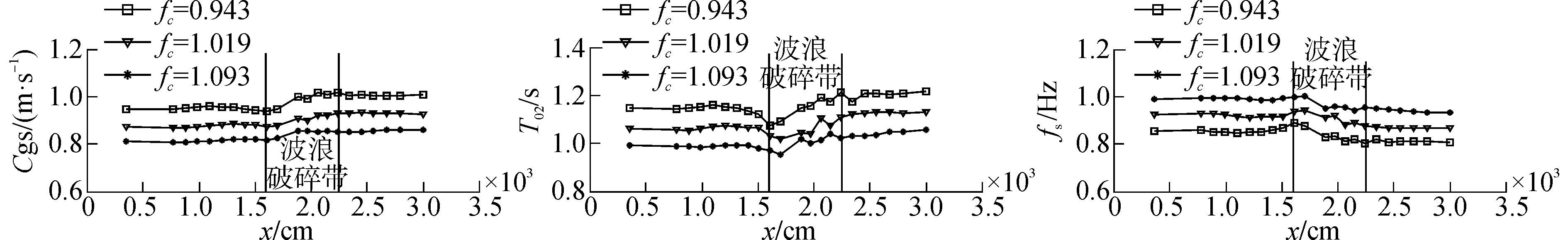 | 图4 CWS谱下不同中心频时Cgs、T02和fs沿水槽变化 Figure 4 The change of Cgs、T02 and fs for different frequencies when it is CWS spectrum |